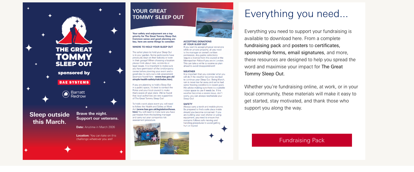 Great Tommy Sleep Out Royal British Veterans Enterprise Empowering Our Braves Date : Anytime in March 2026 Location : Anywhere outdoors Challenge Spend one night, or more, outside to support veteran homelessness Fundraising Target £100 SIGN UP HERE for info.